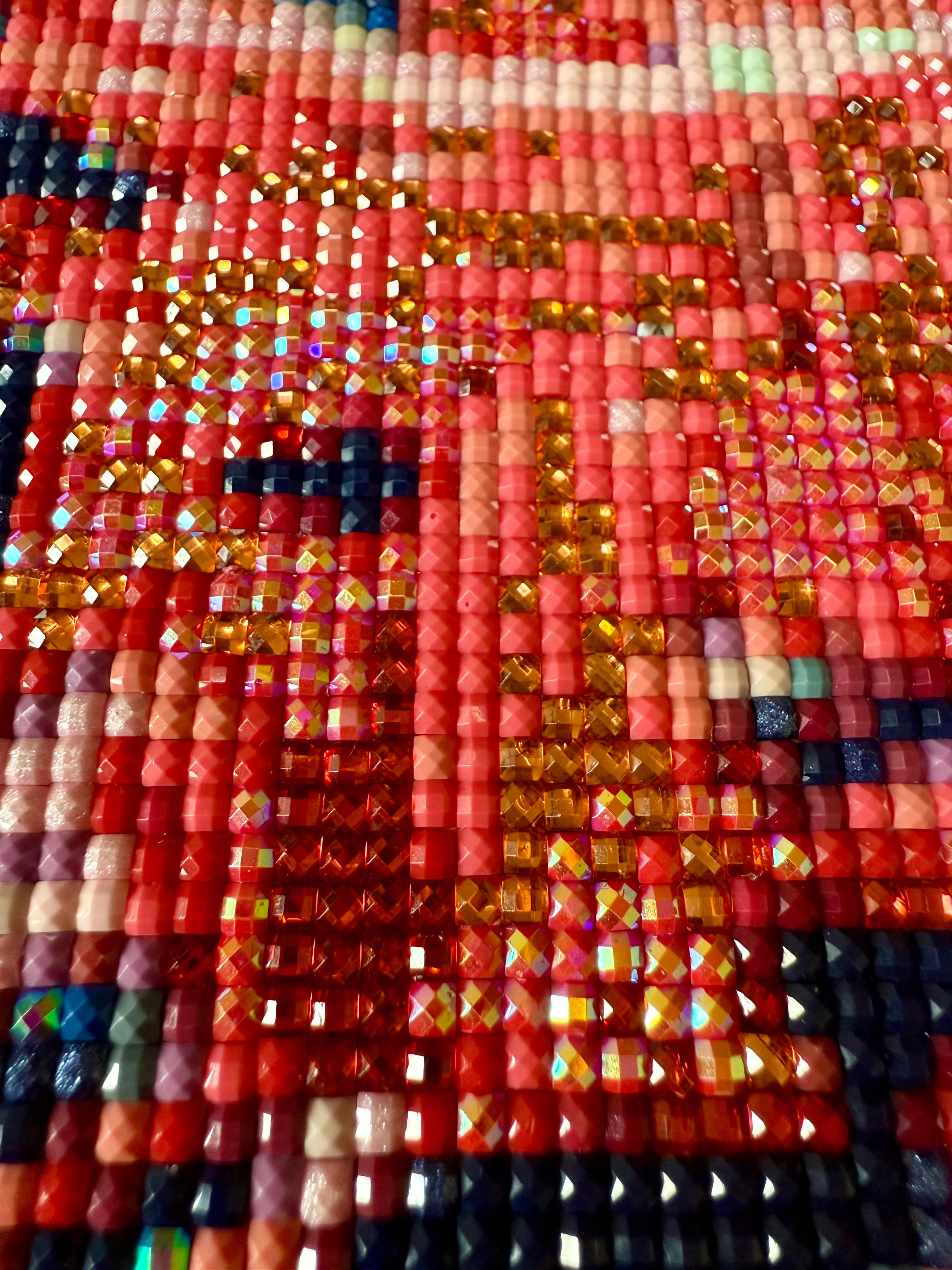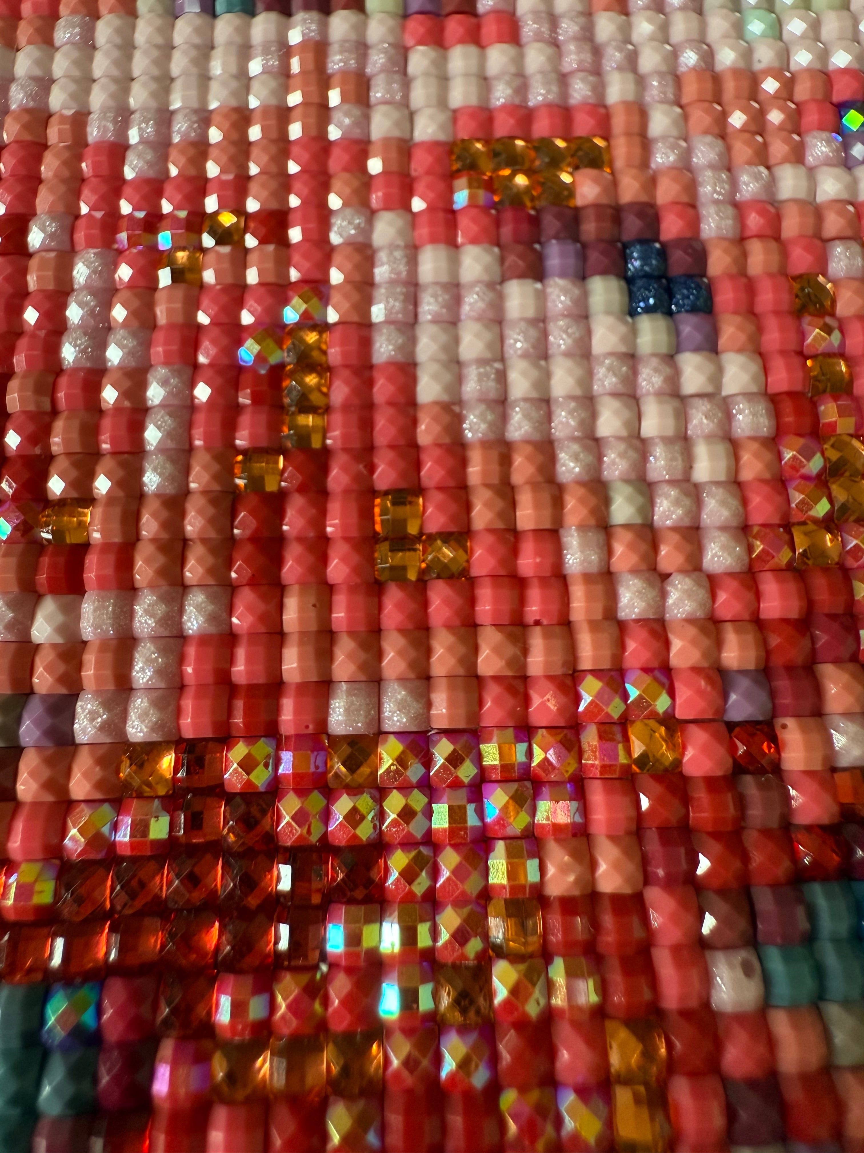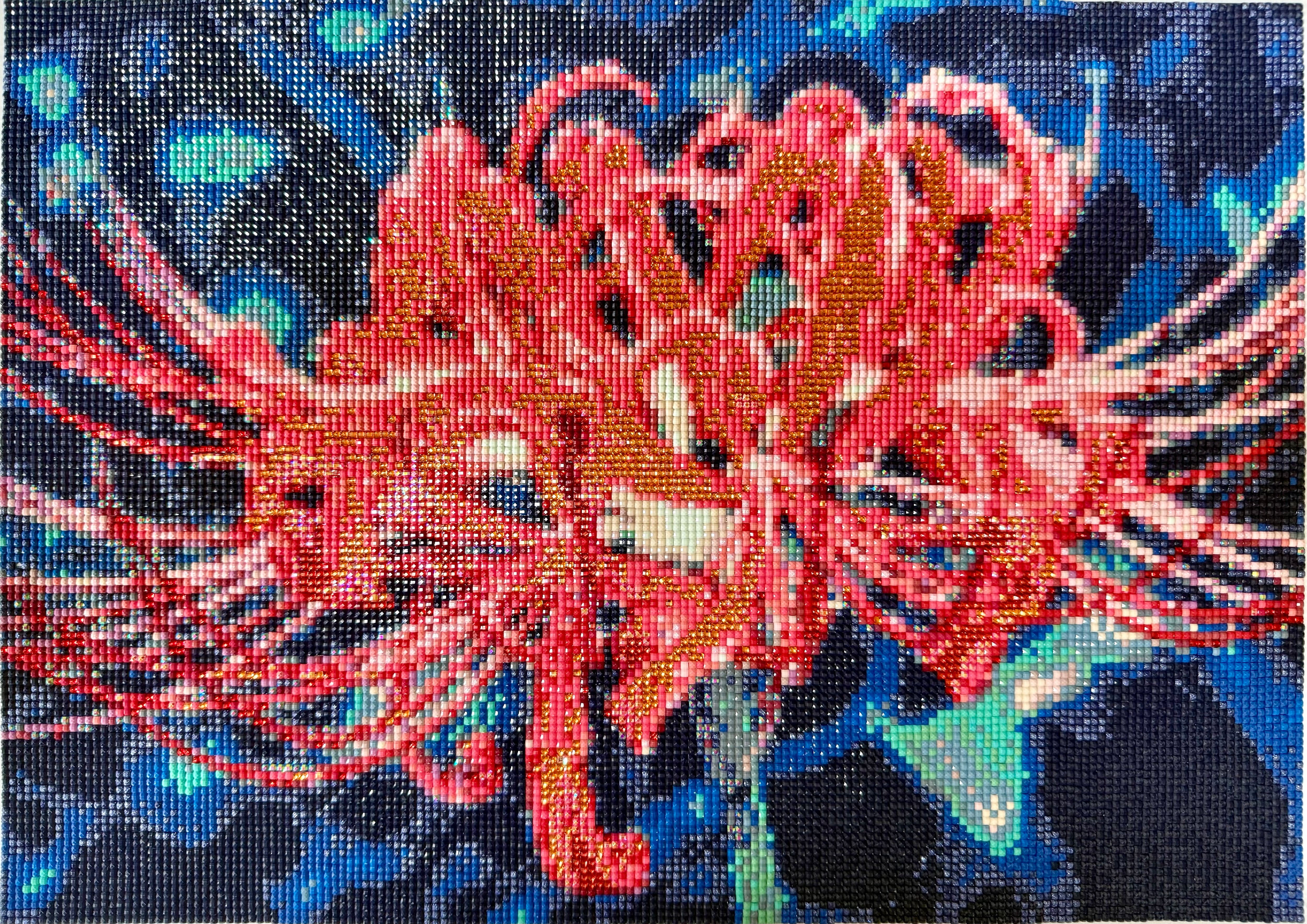フェアリーダストビーズとの組み合わせが美しい背景、対比として輝きを放つオーロラビーズとクリスタルビーズを多用した彼岸花。